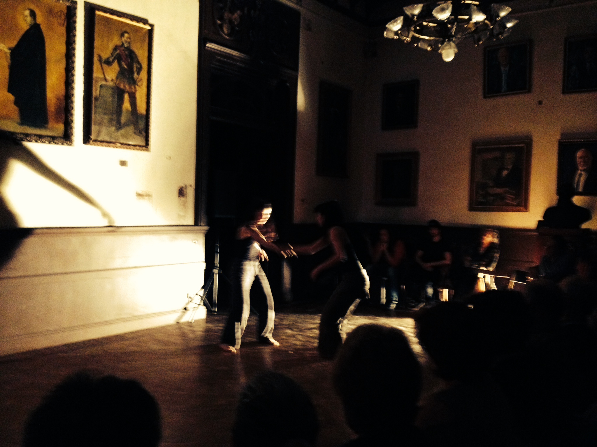 El Estudio es un espacio bastante reciente en Madrid, pero que va dejando huella. O al menos eso es lo que sentimos los y las que estamos dentro del Estudio: que nos deja huella. La sorpresa me la llevé el fin de semana pasado, cuando fui a ver «Muestras nuestras» de la Cía TOM, al encontrarme con una propuesta que reflexiona sobre la huella que las clases dejan también sobre las maestras. Amelia Caravaca y Alejandra Illmer forman un dúo de trabajo y creación en el estudio, las dos enseñan danza contemporánea y a lo largo del año crean y experimentan en las clases. El proceso de enseñanza y aprendizaje es en gran parte proceso creativo, en el que profesoras y alumnos se influyen mutuamente. Sacar al escenario todo este trabajo de aula es una apuesta diferente y generosa: dos creadoras reconocen la importancia del diálogo con los alumnos en su trabajo coreográfico. Y es que todos los maestros, antes de maestros, han sido alumnos. Y casi todos los coreógrafos, además de creadores, son al tiempo profesores. Olvidar esa fase es tanto como perder una parte de la biografía, es como no contar toda la historia, y sin embargo parece que debiera dar vergüenza reconocerla (no solemos encontrar ningún reflejo en los escenarios).