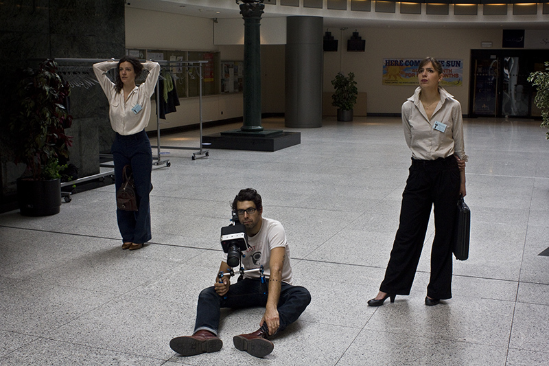 Fue una odisea… imagínate… pero la verdad es que a nosotros nos gustan los retos. Si uno visita el barrio europeo, se encuentra estos edificios de metal y de vidrio, verdaderas moles que son casi como infranqueables. Vives a diario en este barrio y ves entrar y salir a los eurodiputados todos los días con sus trajes de chaqueta, pero tú no puedes entrar como ciudadano, están blindados. Sólo en mayo hacen unas jornadas de puertas abiertas en las que abren parte de los edificios, pero nada más. En aquella época Jorge trabajaba de vez en cuando en el departamento audiovisual del Parlamento, grabando stand-ups de los políticos (que es una de las maneras que tienen hoy en día los eurodiputados de hacer política, consiste básicamente en grabar monólogos ya escritos, que luego se editan y de ahí se difunden a la web, blog, televisión etc., pero no se plantea ningún tipo de diálogo). Desde aquí tuvimos acceso al departamento audiovisual, al que tuvimos que dirigir un dossier detallado sobre el proyecto de la película. Fue un dossier que nos llevó un mes y medio redactar y que difiere bastante del proyecto final. Yo podía entrar una vez a la semana al Parlamento. Estuve yendo durante un mes, lo que me permitió recorrer todos los espacios y observar cómo trabajaba la gente allí. Esto me sirvió para especificar claramente en el dossier cada localización y punto de trabajo, porque la seguridad allí es muy alta y teníamos que concretar todo el planning de trabajo: en qué localización se iba a grabar cada escena, duración de la grabación etc. Tuvimos la suerte de que nos aceptaron el proyecto y nos dieron acreditaciones para todo el equipo, un equipo pequeño de 8 personas. Nosotros fuimos adelante con todo, hicimos el planning de rodaje y todo como si nos fuesen a autorizar, pero no teníamos todavía el sí confirmado y las acreditaciones llegaron tan sólo dos días antes del inicio del rodaje. Para mí fue una situación de mucha tensión pero decidimos arriesgar hasta el final. Desde que empezó el proceso de solicitud hasta ese momento pasaron dos meses, más o menos desde final de marzo de 2013 hasta final de mayo. En el Parlamento estuvimos dos semanas todo el equipo, y luego otros 5 días yendo por separado para finalizar escenas. En total unos 25 días de rodaje en el Parlamento. Sólo estuvimos en este edificio de las instituciones, además de otras localizaciones fuera en la ciudad.